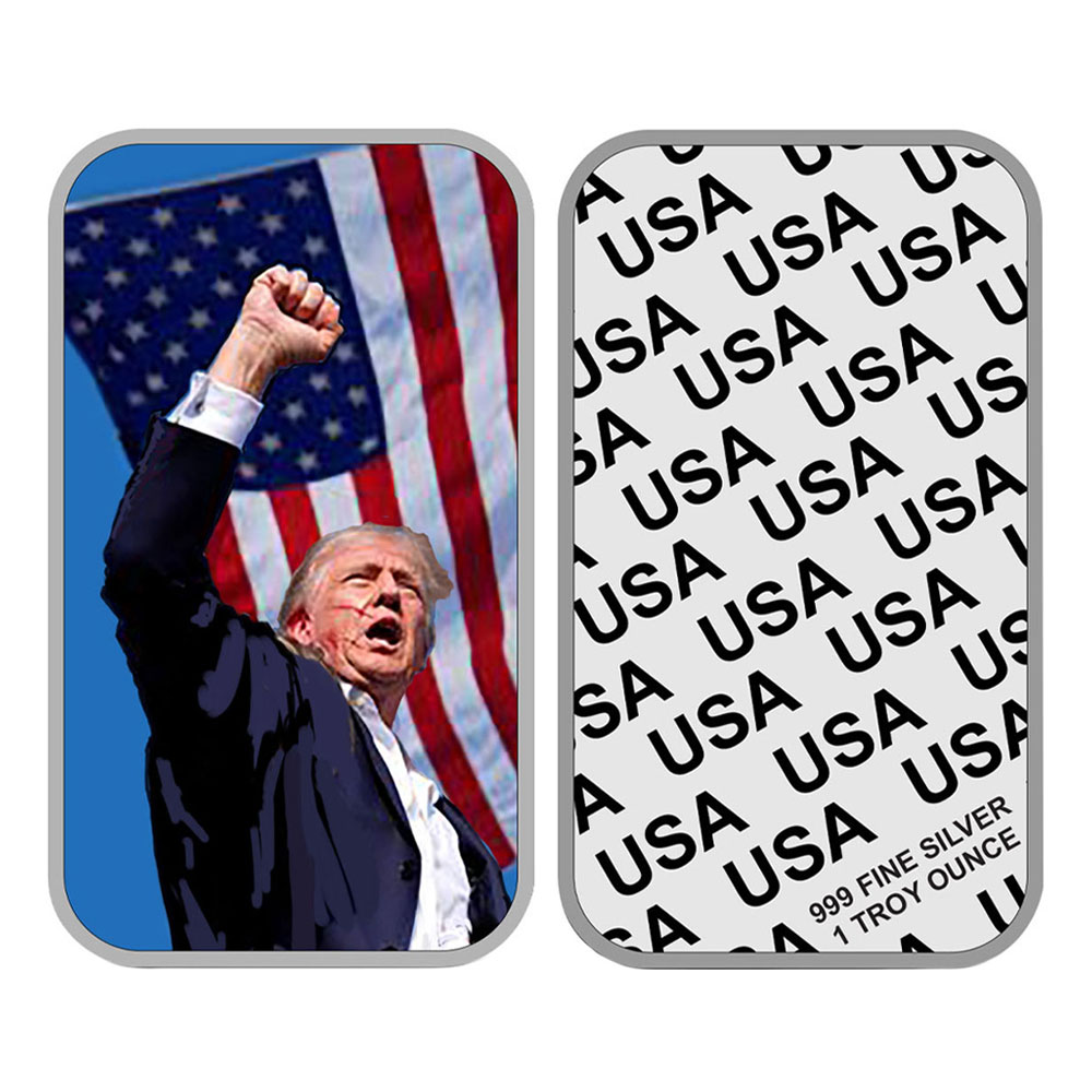 Description: The 1 Troy oz Sunshine Mint Trump Fight Colorized .999 Fine Silver Bar is a captivating addition to any collection. Its striking colorized design and .999 fine silver content make it a standout piece for display or gifting. With a storied design and desirable precious metal content, this bar offers both historical and monetary value.