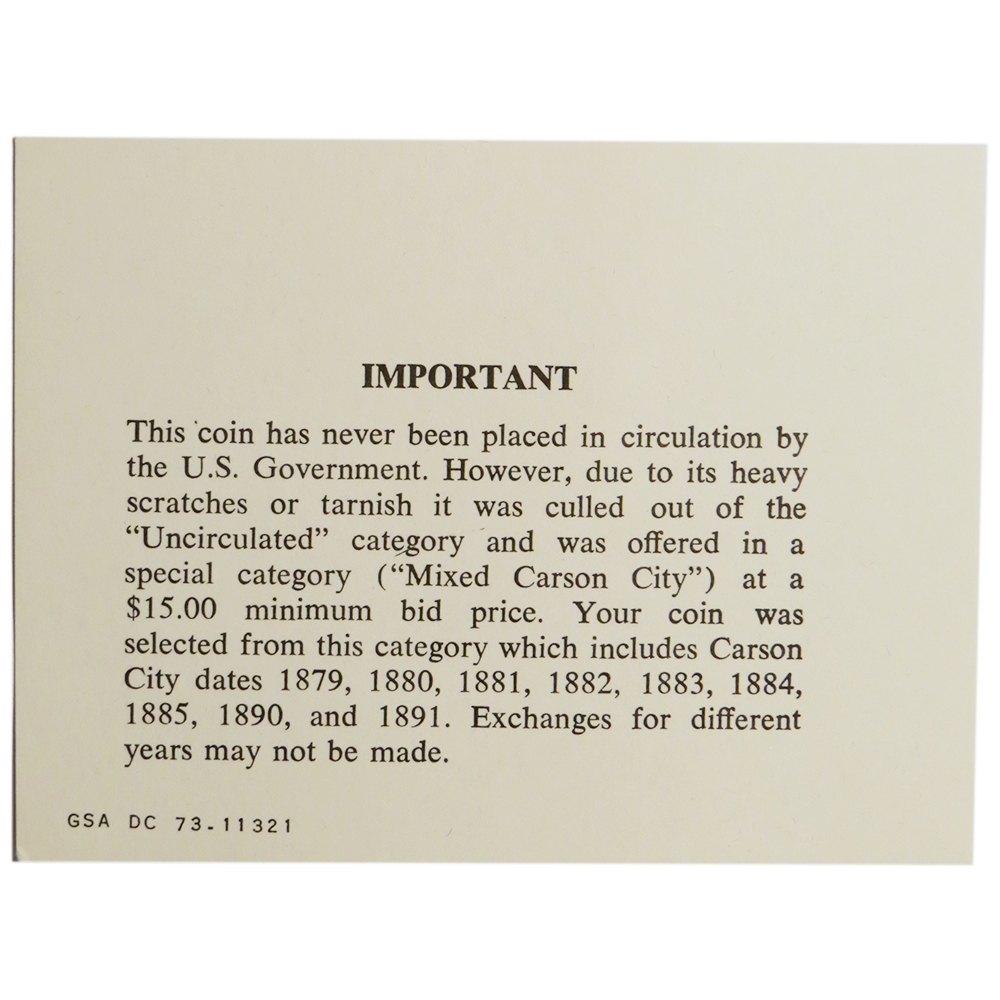 Product Features: Each 1883-CC $1 Morgan Silver Dollar GSA Uncirculated, Box & COA contains 1.0000 troy ounce of .900 fine silver and is shipped to you in protective packaging to ensure its pristine condition is maintained.
