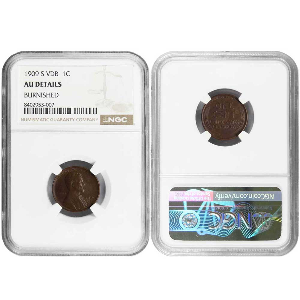Product History: The 1909-S V.D.B. Lincoln Wheat Cent Key Date NGC Au Details Burnished holds a historical significance as it bears the renowned V.D.B. initials of Chief Engraver Victor D. Brenner. This key date coin, with a mintage of just 484,000, marks the first year of issue for the iconic Lincoln Wheat Cent series. Notably, the 1909-S V.D.B. Lincoln Wheat Cent holds a special place in American numismatic history as a collector’s favorite.