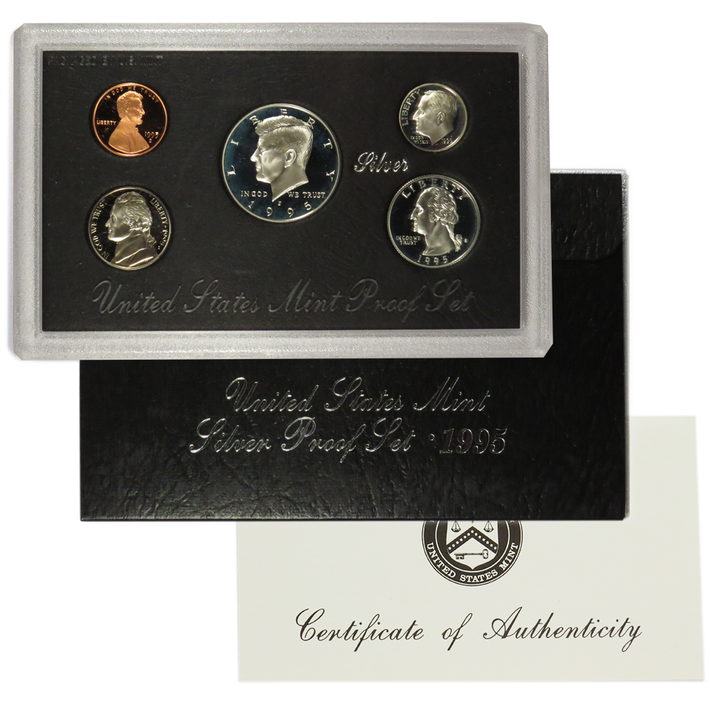 Product History: The 1995-S U.S. Silver Proof Set is a collectible set of coins from the 50 states, including a Kennedy half-dollar, a Washington quarter, a Roosevelt dime, a Jefferson nickel, and a Lincoln cent. The set is significant for its high-quality proof coins and the inclusion of 90% silver coins, making it an appealing addition to any collection.
