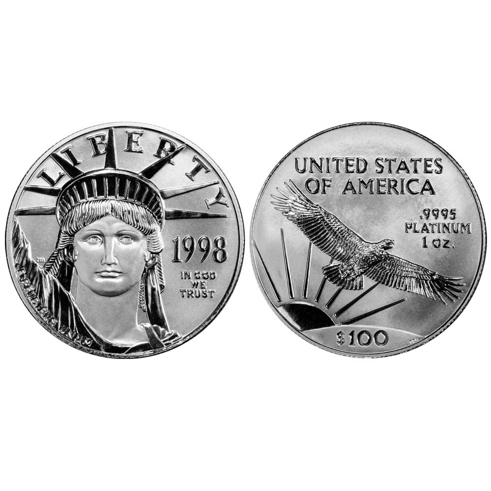 Product Features: The 1998 $100 American Platinum Eagle 1 oz contains 1 troy ounce of .9995 fine platinum and is shipped in protective packaging to ensure its immaculate condition.