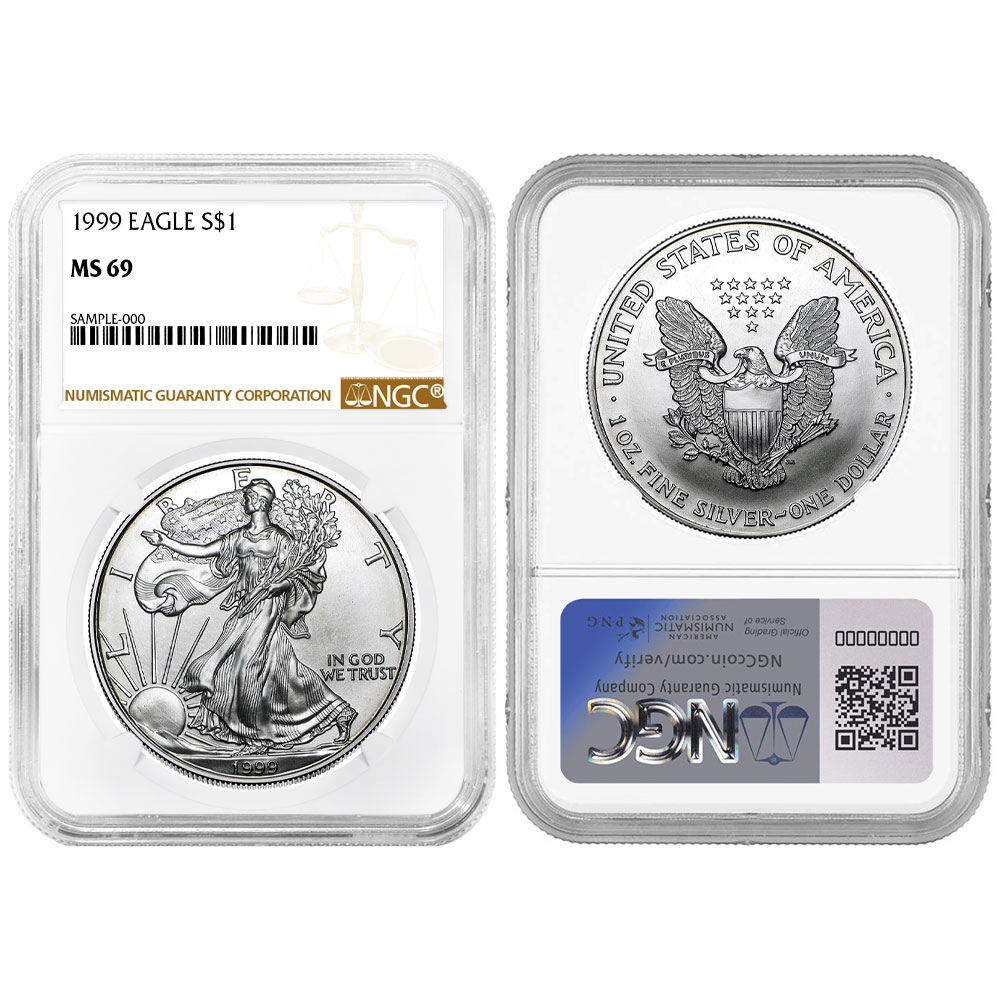Product Features: The 1999 $1 American Silver Eagle NGC MS69 Brown Label contains 1 troy ounce of .999 fine silver and features the timeless Walking Liberty design on the obverse and a heraldic eagle on the reverse.