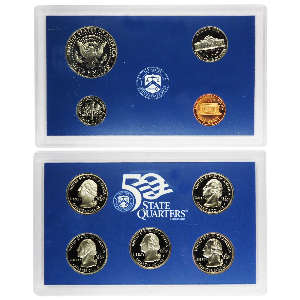 Product Features: The 1999-S U.S. Clad Proof Set contains 5 quarters, 1 dime, 1 nickel, 1 penny, and 1 Kennedy half dollar. The coins are clad—composed of an outer layer of 75% copper and 25% nickel, over a core of pure copper. Each set is shipped in protective packaging to preserve their brilliance and condition.