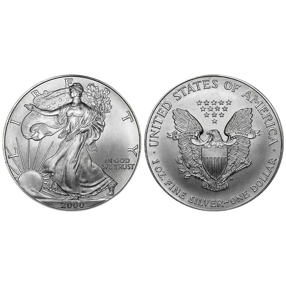 Product Features: Each of these one-ounce coins contains .999 fine silver and is backed by the U.S. government for its weight and purity. The 2000 $1 American Silver Eagle 1 oz Brilliant Uncirculated arrives in a protective plastic flip to preserve its stunning Brilliant Uncirculated condition.
