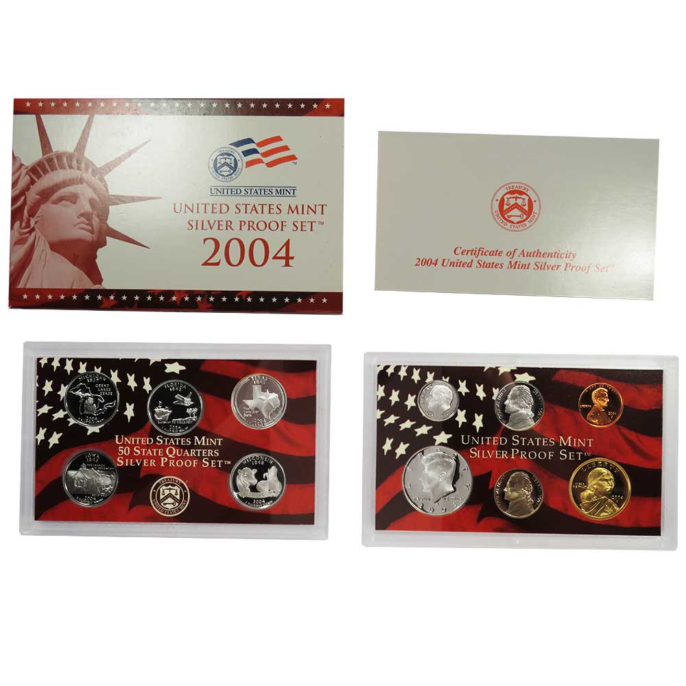 Product Features: The 2004 U.S. Mint Silver Proof Set consists of 90% silver coins, including the Kennedy half dollar, the state quarters, the Roosevelt dime, and the Lincoln cent. Each set comes in original U.S. Mint protective packaging to preserve its condition.