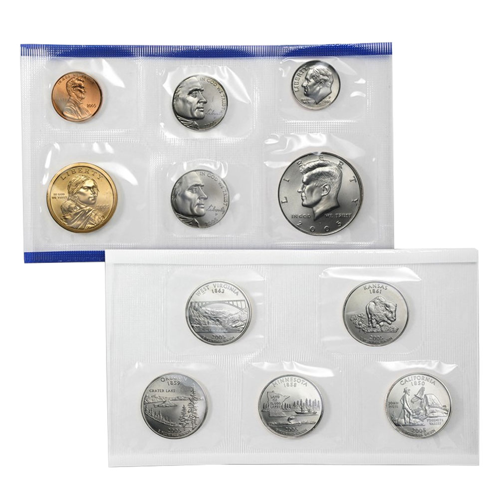 Product Features: The set contains 22 uncirculated examples of the year’s circulating coinage, with 11 coins from the Denver Mint and 11 coins from the Philadelphia Mint. Each set consists of a Lincoln cent, two 2005 Westward Journey nickels, Roosevelt dime, five state quarters, a Kennedy half dollar, and a Sacagawea dollar. The five state quarters including are California, Kansas, Minnesota, Oregon, and West Virginia.
