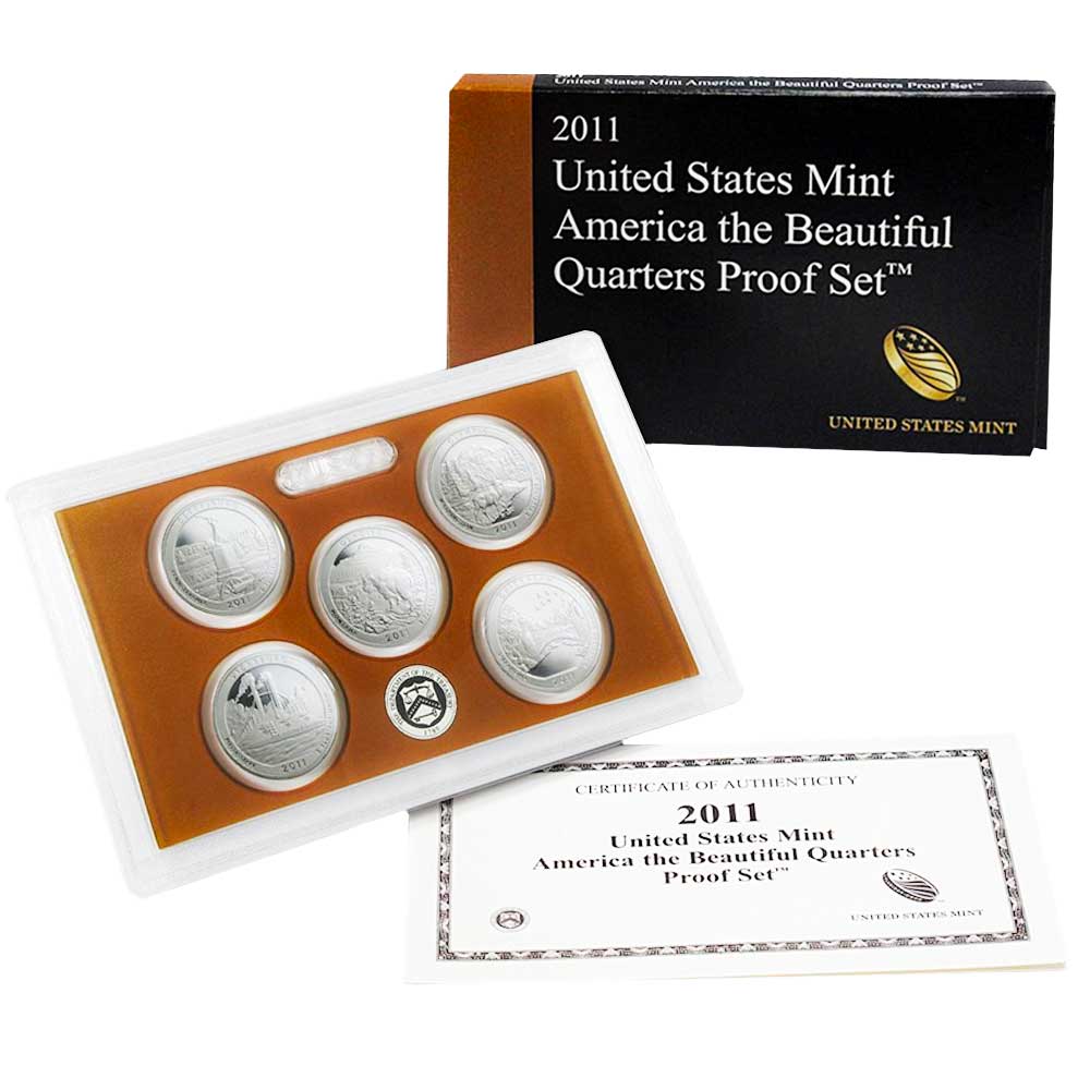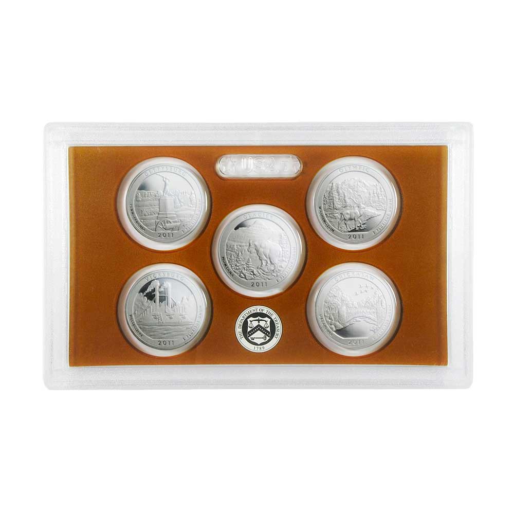 Product History: The 2011-S U.S. Clad America The Beautiful Quarters Proof Set was released by the United States Mint as part of the America the Beautiful Quarters Program. This set includes five beautifully crafted proof quarters, each representing a different national park or site from across the United States. Notable locations featured in this set are Gettysburg National Military Park, Glacier National Park, Olympic National Park, Vicksburg National Military Park, and Chickasaw National Recreation Area.
