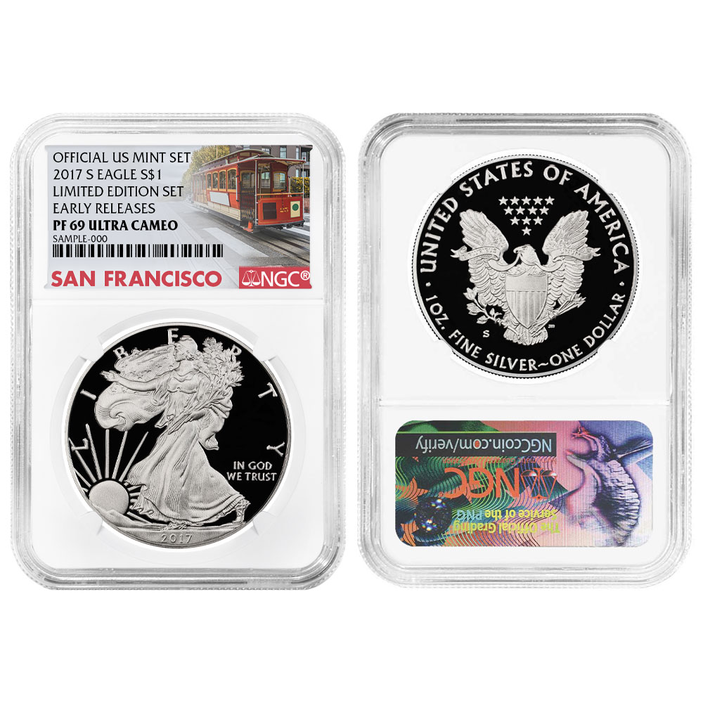 Product History: The 2017-S Proof $1 American Silver Eagle Limited Edition Set NGC PF69UC Blue ER Label marks a historic moment in United States coinage. The American Silver Eagle series has been a cornerstone of the precious metals market since its debut in 1986, and the limited edition set adds a new layer of desirability. This set was struck at the San Francisco Mint and is one of the keys to completing a full set of Silver Eagles, making it highly sought after by collectors and investors alike.