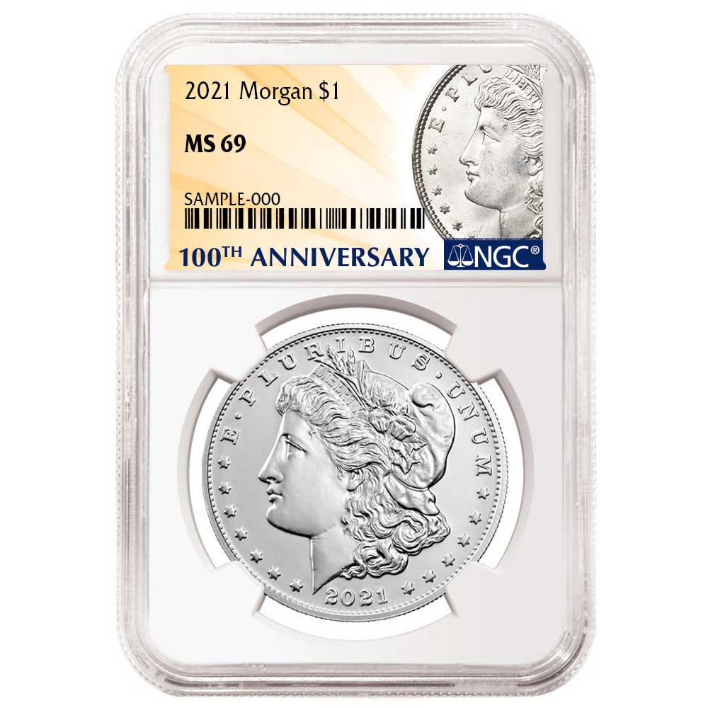 Product History: The 2021 $1 Morgan Silver Dollar NGC MS69 100th Anni. Label marks the 100th anniversary of the final year of the Morgan Silver Dollar. Originally produced from 1878 to 1904, and once more in 1921, these coins are cherished for their historical significance and beauty.