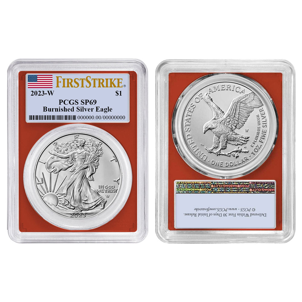 2023-W Burnished $1 American Silver Eagle PCGS SP69 FS Flag Label Red Frame