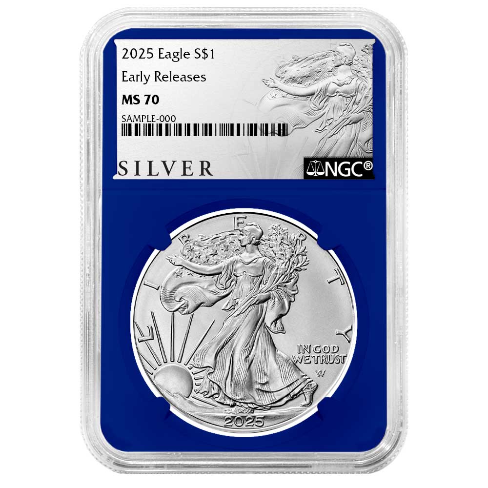 The American Silver Eagle is considered one of the most popular coins worldwide. The creation of these iconic 1 Troy oz of .999 fine silver coins was authorized through the Liberty Coin Act of 1985, and production began in 1986. Known to many as the official bullion coin of the United States, a redesign was introduced by the U.S. Mint in 2021. The original obverse design, based on Adolph A. Weinman’s 1916 “Walking Liberty” half dollar, has been updated with the help of modern technology. Now a closer reflection of Weinman’s original design, the obverse includes the addition of the traditional artist’s mark on the coin itself. As with the obverse, the reverse of the Silver Eagle also received an update in design. Before the summer of 2021, the design was that of the heraldic eagle of the United States, which was created by the former Chief Engraver of the United States Mint, John Mercanti. This design features an American bald eagle behind a heraldic shield with arrows and an olive branch in its talons. The new reverse design, also known as “Eagle Landing,” shows an eagle approaching a landing, carrying an oak branch to add to a nest. One of the U.S. Mint’s Artistic Infusion Program designers, Emily Damstra, created this new reverse design.