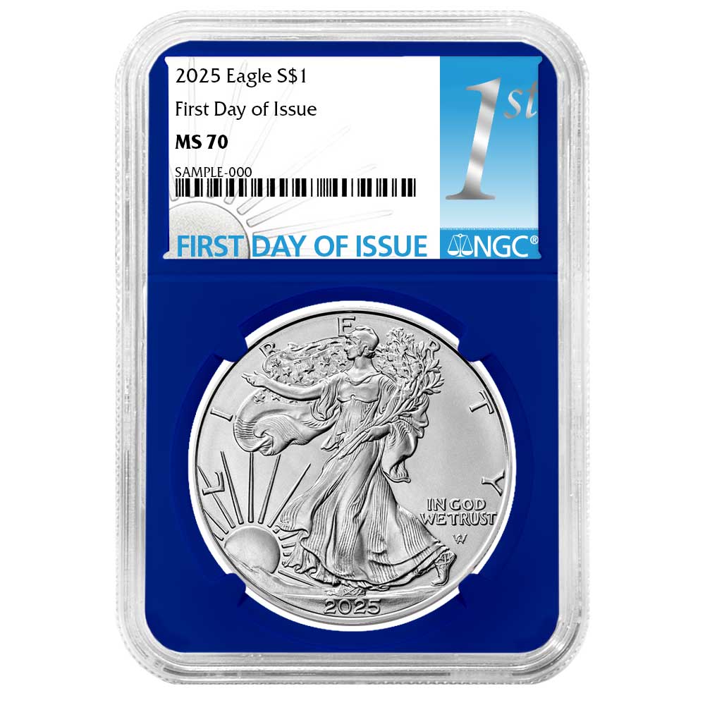 The American Silver Eagle is considered one of the most popular coins worldwide. The creation of these iconic 1 Troy oz of .999 fine silver coins was authorized through the Liberty Coin Act of 1985, and production began in 1986. Known to many as the official bullion coin of the United States, a redesign was introduced by the U.S. Mint in 2021. The original obverse design, based on Adolph A. Weinman’s 1916 “Walking Liberty” half dollar, has been updated with the help of modern technology. Now a closer reflection of Weinman’s original design, the obverse includes the addition of the traditional artist’s mark on the coin itself. As with the obverse, the reverse of the Silver Eagle also received an update in design. Before the summer of 2021, the design was that of the heraldic eagle of the United States, which was created by the former Chief Engraver of the United States Mint, John Mercanti. This design features an American bald eagle behind a heraldic shield with arrows and an olive branch in its talons. The new reverse design, also known as “Eagle Landing,” shows an eagle approaching a landing, carrying an oak branch to add to a nest. One of the U.S. Mint’s Artistic Infusion Program designers, Emily Damstra, created this new reverse design.