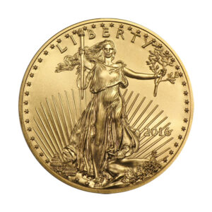 In 1986 the U.S. Mint introduced to investors the American Gold Eagle coins with a purity of .9167 percent. The coin’s original obverse features the full-length figure of Lady Liberty complete with flowing hair and holding a torch in her right hand and an olive branch in her left, designed by Augustus Saint-Gauden. The reverse of this coin was created by Miley Busiek Frost, who incorporated a male eagle carrying an olive branch while flying above a nest containing hatchlings and their mother, entitled the “Family of Eagles.”