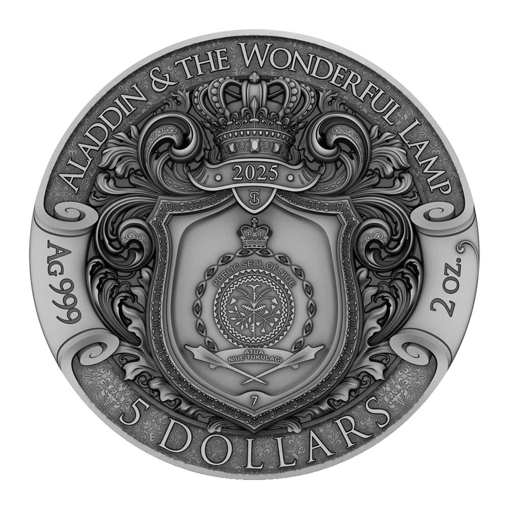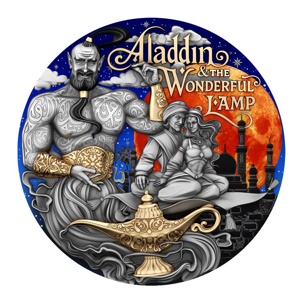 Product History: The 2025 Aladdin and the Wonderful Lamp 2 oz Antiqued Silver Coin By T&S Coin Mintage of 500 commemorates the beloved character and story from “One Thousand and One Nights.” This coin captures the enchanting tale of Aladdin as he finds a magical lamp and the genie within. With a mintage of only 500, this is a limited-edition release that will surely delight collectors and fans of classic folklore.