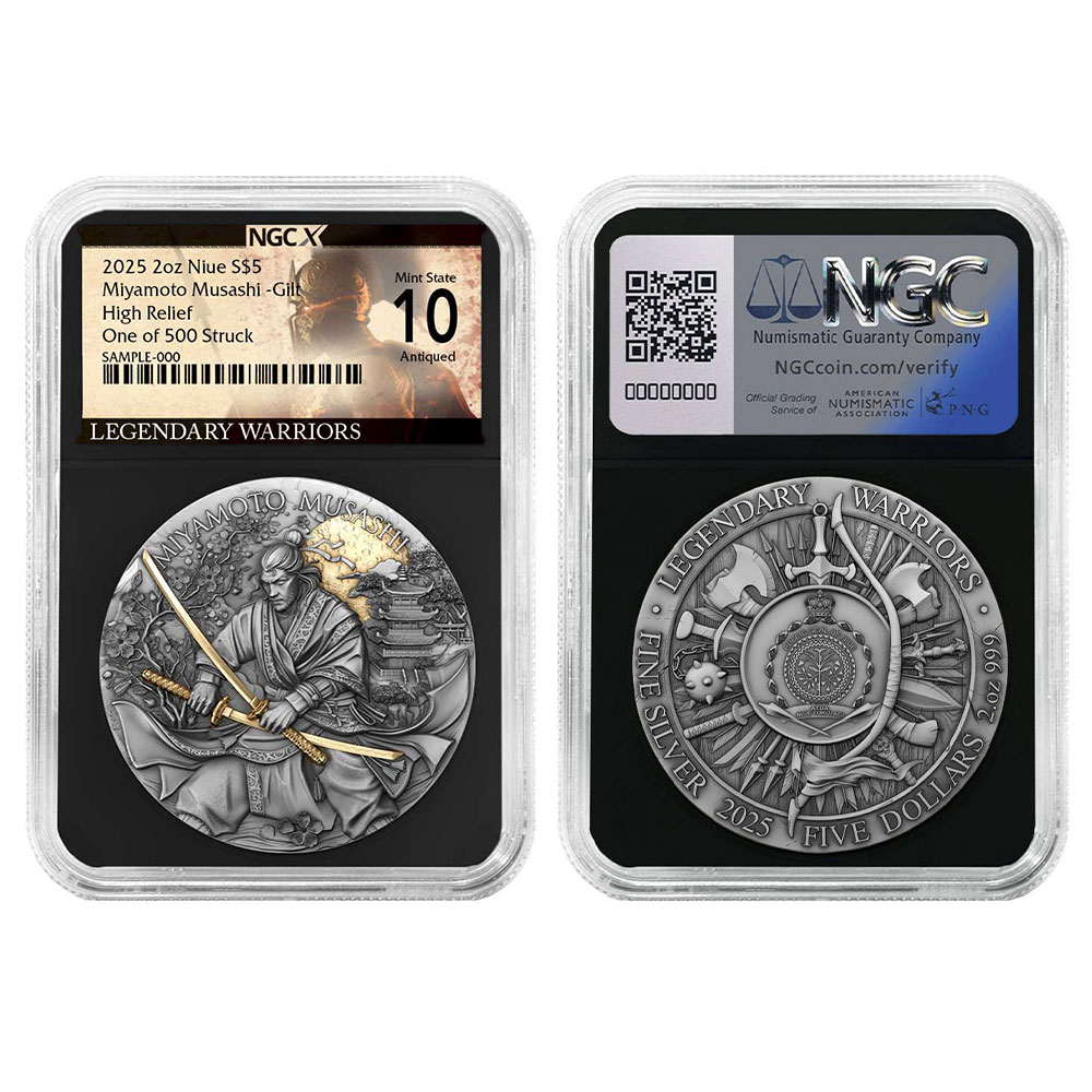 2025 Miyamoto Musashi 2 oz High Relief Silver Antiqued & Gold Gilded NGCX MS10 Legendary Warriors Label Retro Core