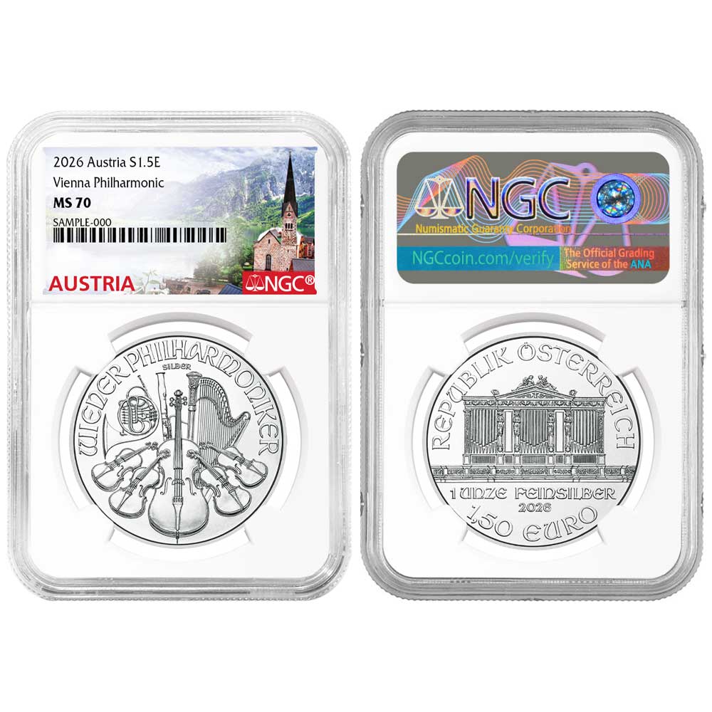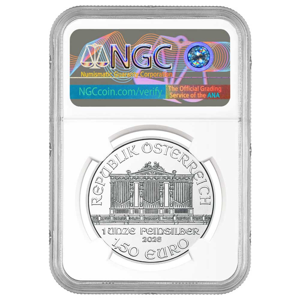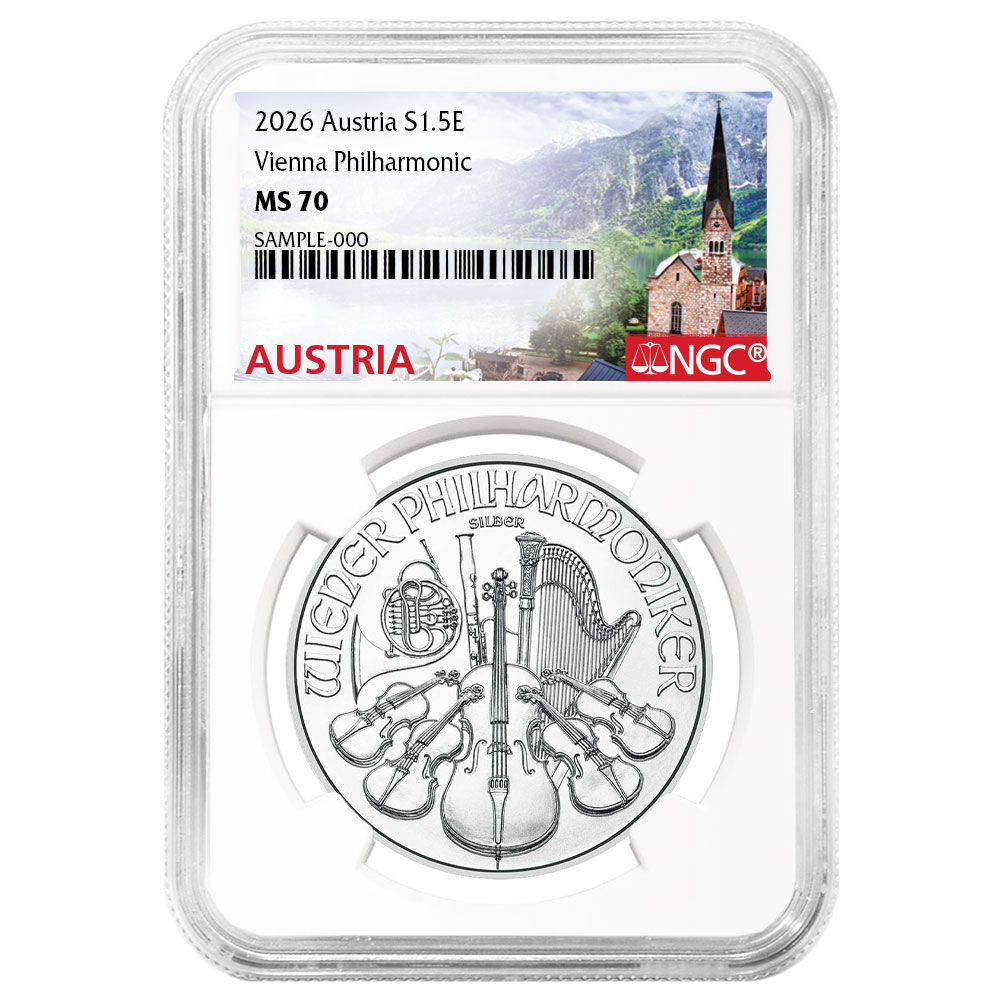 The Austrian Philharmonic coins, which are 1 Troy oz of .999 pure silver, were first introduced in 2004 paying tribute to the country’s illustrious musical treasure, the Vienna Philharmonic. The coin’s obverse features the pipe organ from the Golden Hall in Musikverein, which opened in 1870, and is home to the Vienna Philharmonic. The artist designed the reverse of this coin capturing an array of musical instruments such as a harp, violins, a cello, bassoon, and a Vienna horn.