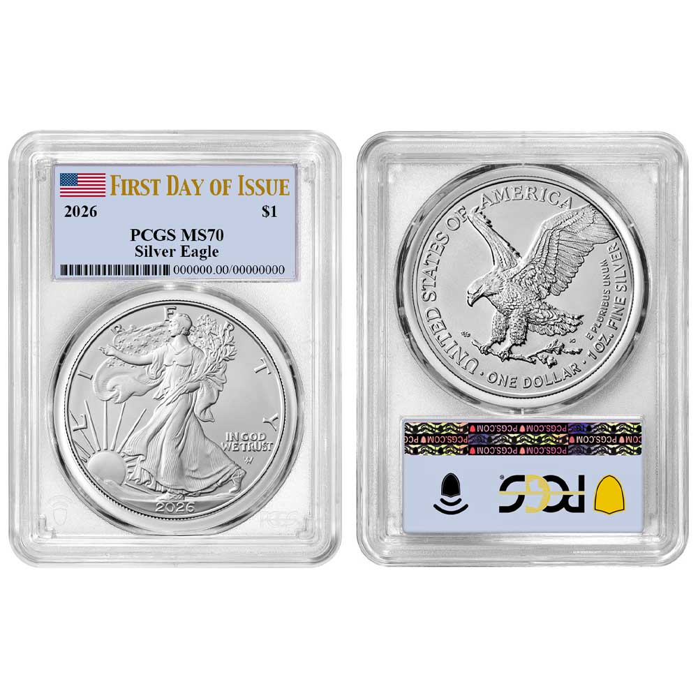 2026 $1 American Silver Eagle PCGS MS70 FDOI Flag Label
