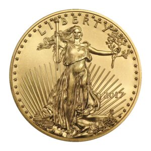 In 1986 the U.S. Mint introduced to investors the American Gold Eagle coins with a purity of .9167 percent. The coin’s original obverse features the full-length figure of Lady Liberty complete with flowing hair and holding a torch in her right hand and an olive branch in her left, designed by Augustus Saint-Gauden. The reverse of this coin was created by Miley Busiek Frost, who incorporated a male eagle carrying an olive branch while flying above a nest containing hatchlings and their mother, entitled the “Family of Eagles.”