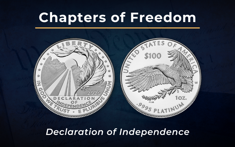 The American Platinum Eagle Proof series launches a three-year thematic program in 2026 called “The Charters of Freedom.” This multi-year celebration honors America’s foundational documents: the Declaration of Independence debuts in 2026, followed by the U.S. Constitution in 2027 and the Bill of Rights in 2028.
